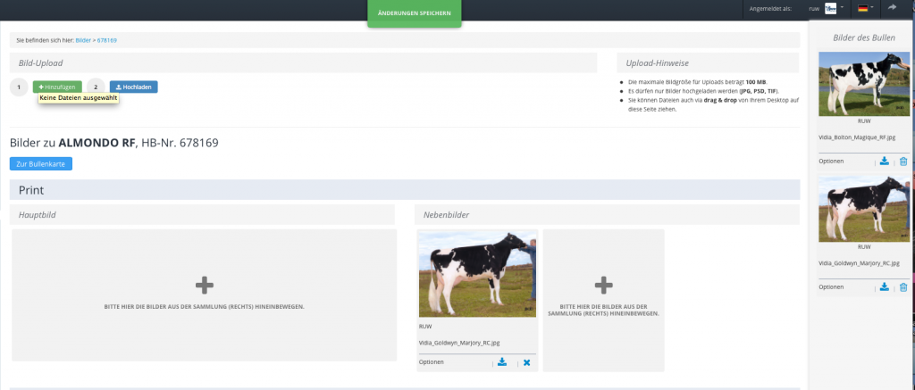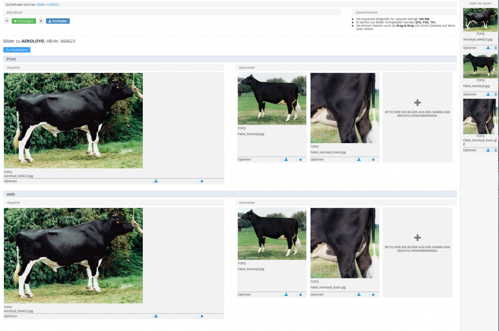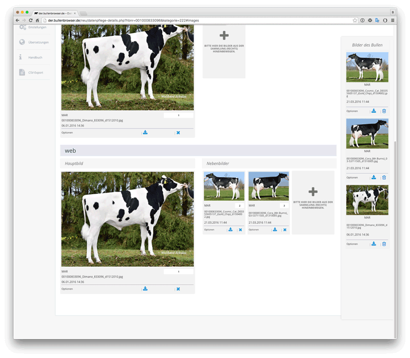 Via drag & drop oder den Button „+Hinzufügen“ können Sie dem ausgewählten Bullen weitere Bilder anhängen.