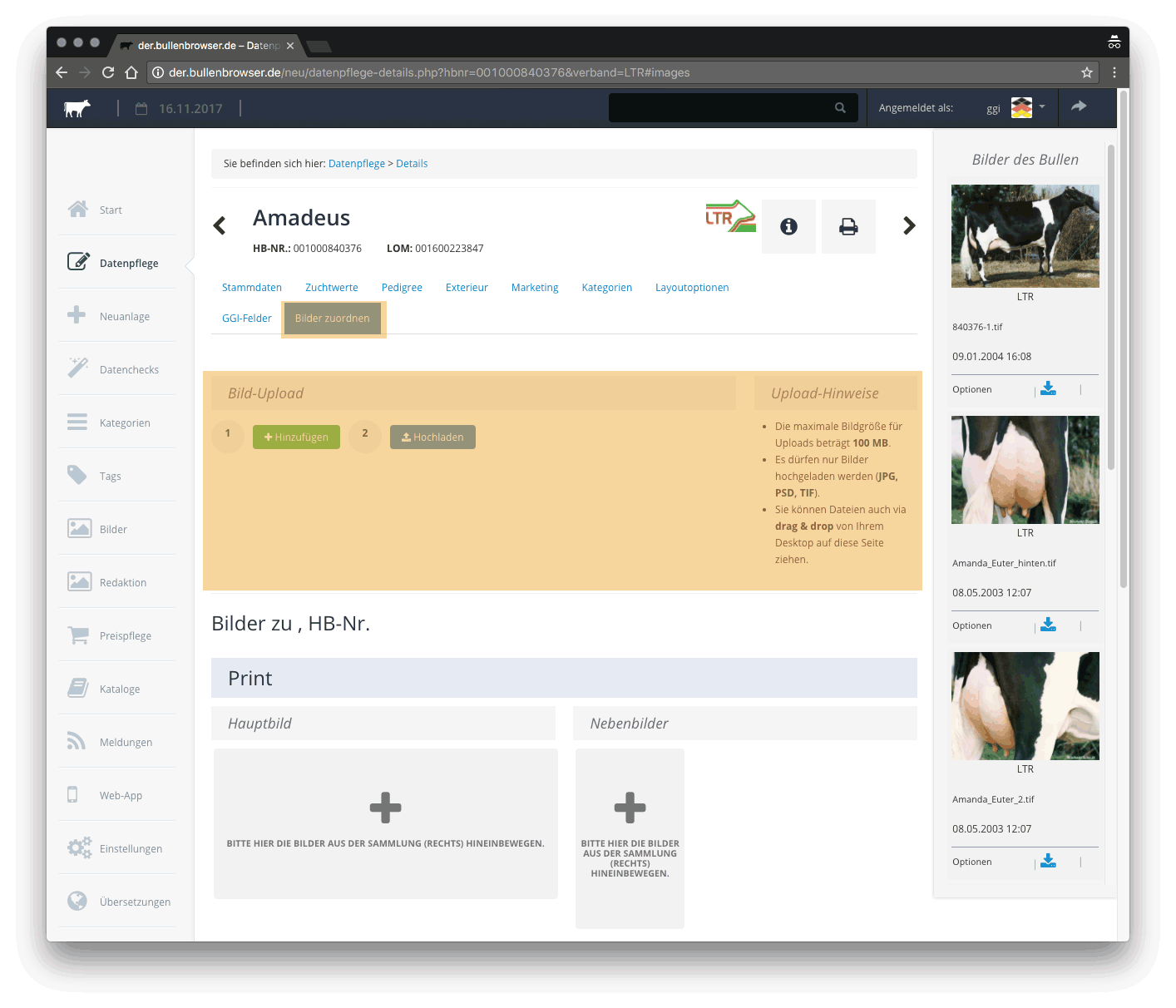 Das Hinzufügen neuer Bilder in den Bullenbrowser ist an zwei Orten möglich. Im Bullendetail im Reiter Bilder zuordnen und im Bild-Modul: