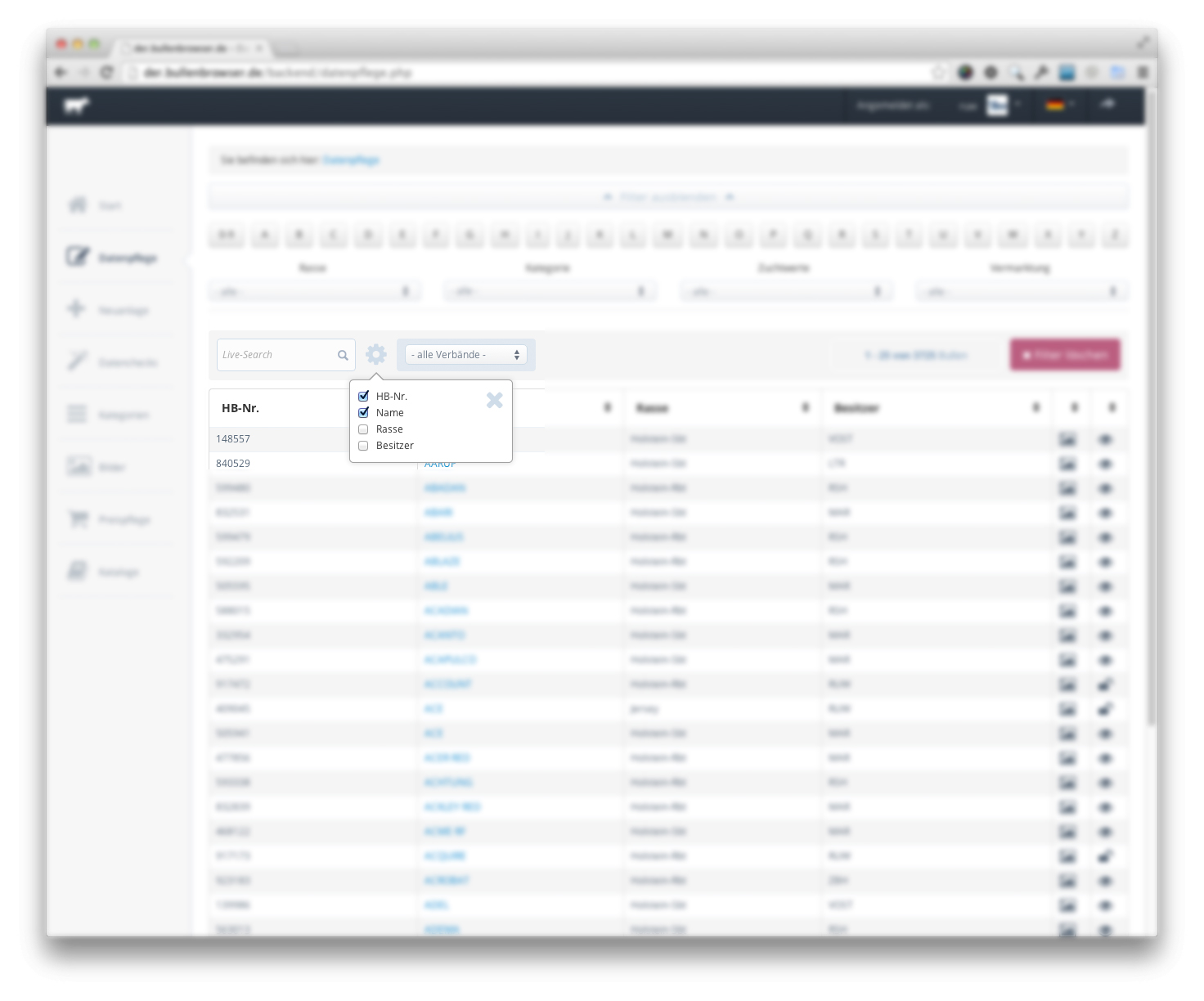 Per default werden Herdbuchnummer und Bullenname durchsucht. Sie können aber auch die Spalten für Rasse und Besitzer zu den suchrelevanten Spalten hinzufügen. Dafür benutzen Sie bitte das Einstellungs-Symbol direkt neben der Suche.